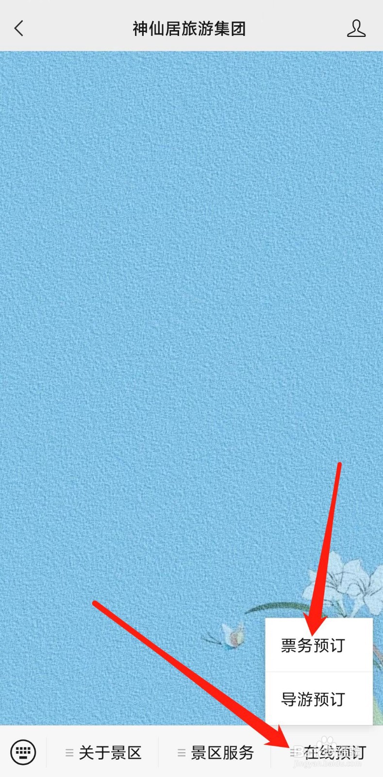 1、进入“神仙居旅游集团”公众号,点击“在线预订”,选择“票务预订”。